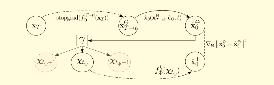 - Дискриминатор для ускорения выборки: Один из ключевых недостатков диффузионных моделей — медленная выборка. Дискриминатор может быть обучен оценивать реалистичность изображений на каждом шаге денойзинга. Это позволяет нам сократить количество шагов, необходимых для получения высококачественного изображения, поскольку Дискриминатор может помочь диффузионной модели быстрее сходиться к реалистичным результатам. Например, Дискриминатор может предсказывать, насколько "хорошо" изображение выглядит после нескольких шагов, позволяя пропустить некоторые промежуточные шаги.